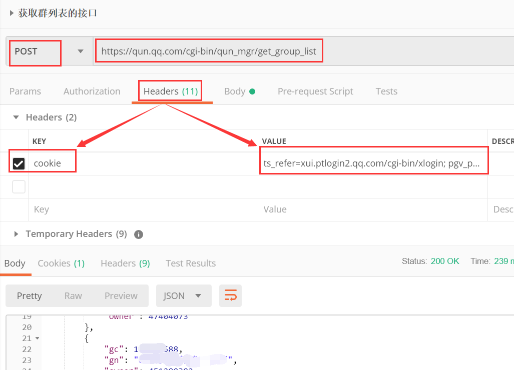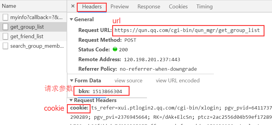 ①get_group_list-------------获取群列表的接口,从header中找到URL、请求参数、cookie
