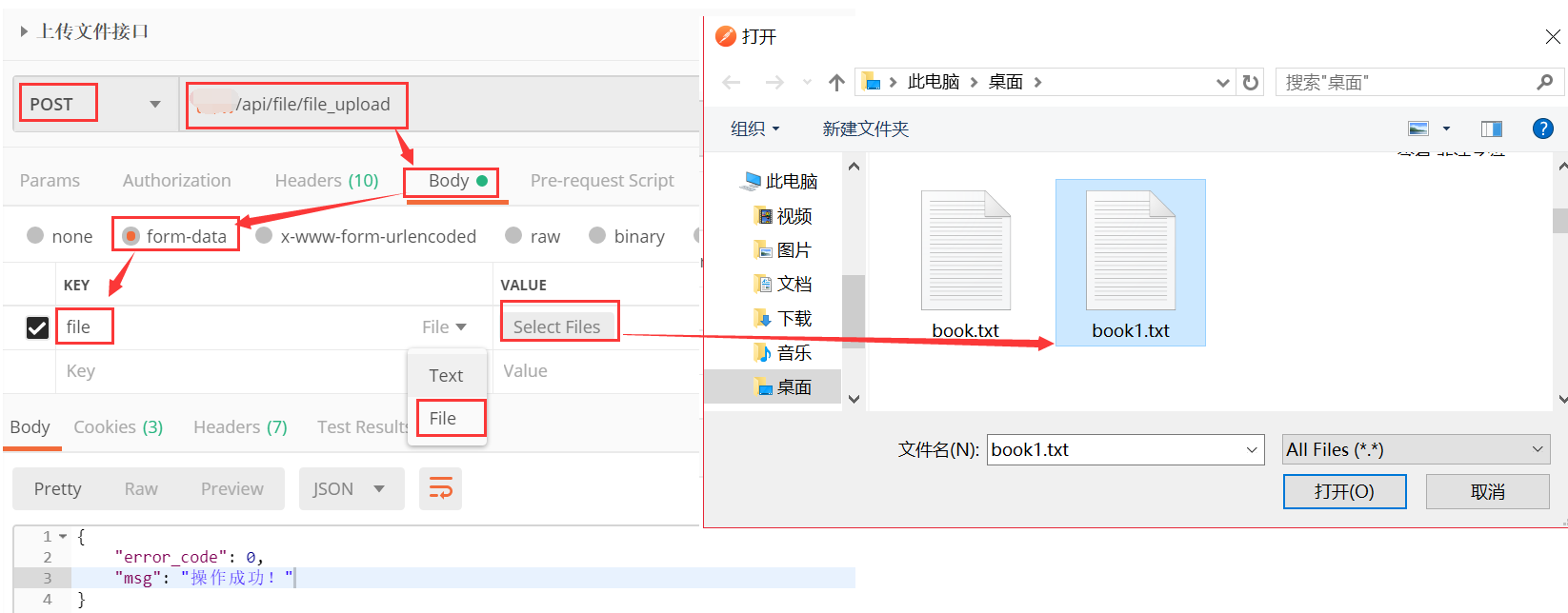 填写URL,请求方法,body--->form_data--->填写key---->选择file----->value栏