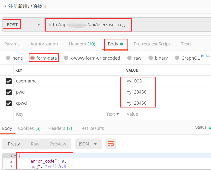 ②注册接口:填写URL,请求方法,在body-->form-data里面填写参数以及value。注册一个新的登录用户,然后看看注册的用户能否登录。
