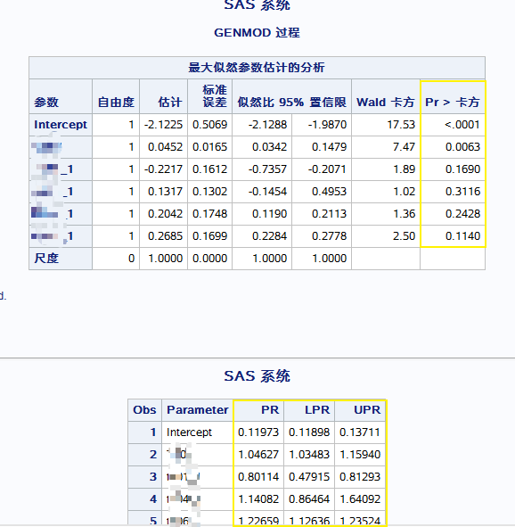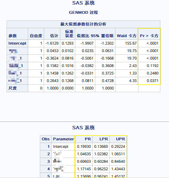 PROC GENMOD DATA = AB DESCENDING ;ODS SELECT PARAMETERESTIMATES ;ODS OUTPUT PARAMETERESTIMATES= AB_PARA;WEIGHT W;/*对w 进行加权处理*/MODEL y = x1 x2 x3 x4 x5 /DIST= BIN LINK= LOG INTERCEPT = -1LRCI;RUN ;DATA AB_PARA0 ;SET AB_PARA ;PR= EXP(ESTIMATE);LPR= EXP(LOWERLRCL);UPR= EXP(UPPERLRCL);KEEP PARAMETER PR LPR UPR;RUN;PROC PRINT DATA = AB_PARA0 ;RUN;