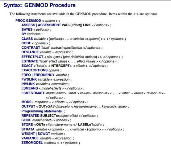PROC GENMOD 的详细使用可参照SAS help 手册。