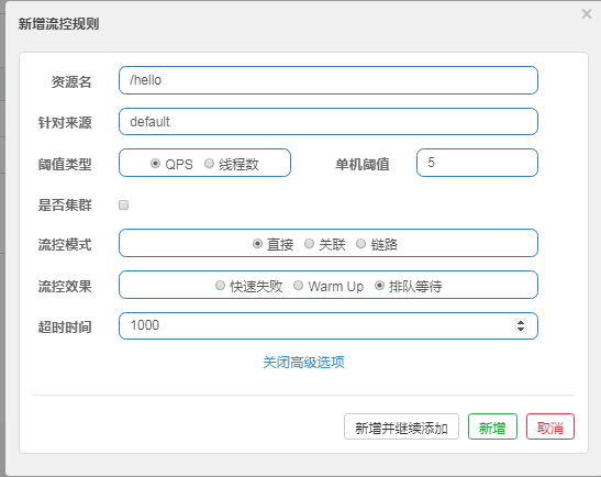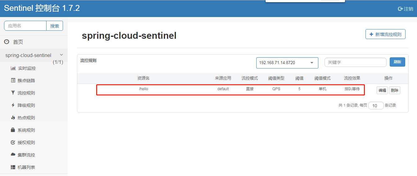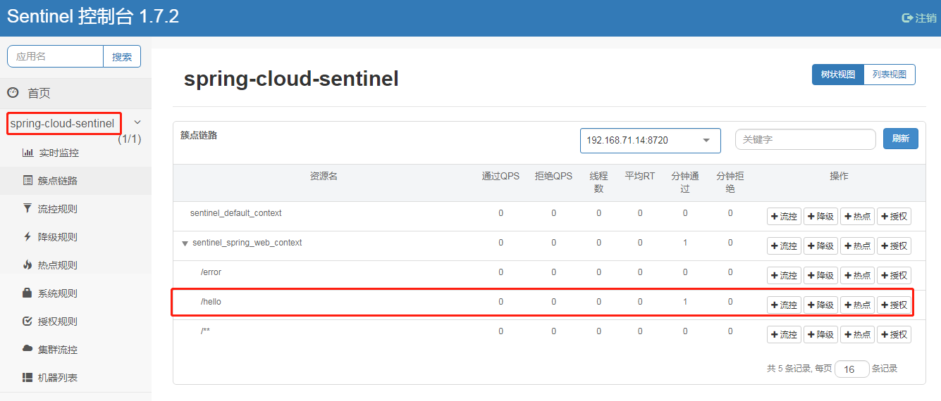 启动项目之后,访问 http://127.0.0.1:8081/hello ,之后,在 Sentinel 控制台页面上就能看到这个应用及 /hello 接口了,下面新增流控配置,限制每 1 秒中响应 5 个请求: