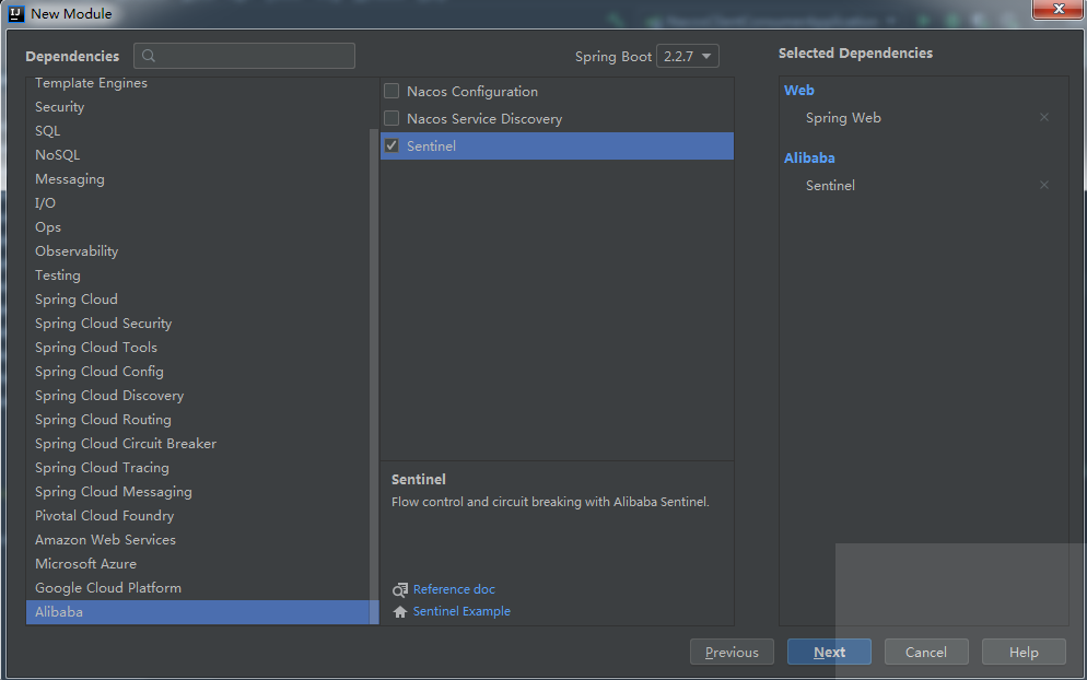 创建 Spring Boot 项目 spring-cloud-sentinel ,添加 Web/Sentinel 依赖,如下: