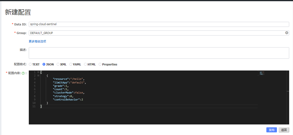 然后,在 Nacos 后台增加配置(注意 Data Id/GROUP 要与上述配置文件中的配置对应上), JSON 格式,内容其实就是对应前面章节 Sentinel 控制台页面上配置的流控规则。