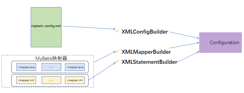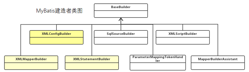 XMLConfigBuilder: 主要负责解析mybatis-config.xml; XMLMapperBuilder: 主要负责解析映射配置文件; XMLStatementBuilder: 主要负责解析映射配置文件中的SQL节点;