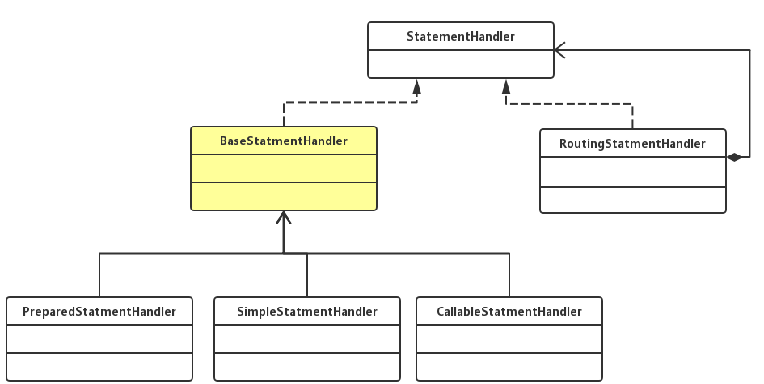 BaseStatementHandler:所有子类的抽象父类,定义了初始化statement的操作顺序,由子类实现具体的实例化不同的statement(模板模式);