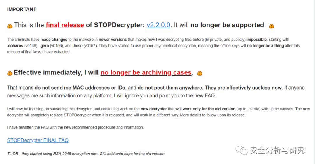 然而遗憾的是,STOP解密工具宣布停止更新了,因为此勒索病毒运营团伙在新版的几个STOP勒索病毒变种中,使用了新的加密算法,导致无法解密