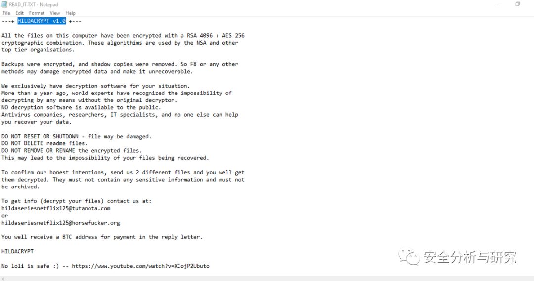 此勒索病毒的加密后缀名为:HILDA,生成的勒索提示信息文件READ_IT.txt,内容如下所示: