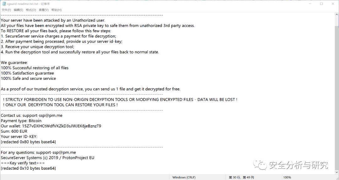 此勒索病毒的加密后缀为sguard,勒索提示信息文本文件SGUARD-README.txt,内容如下所示: