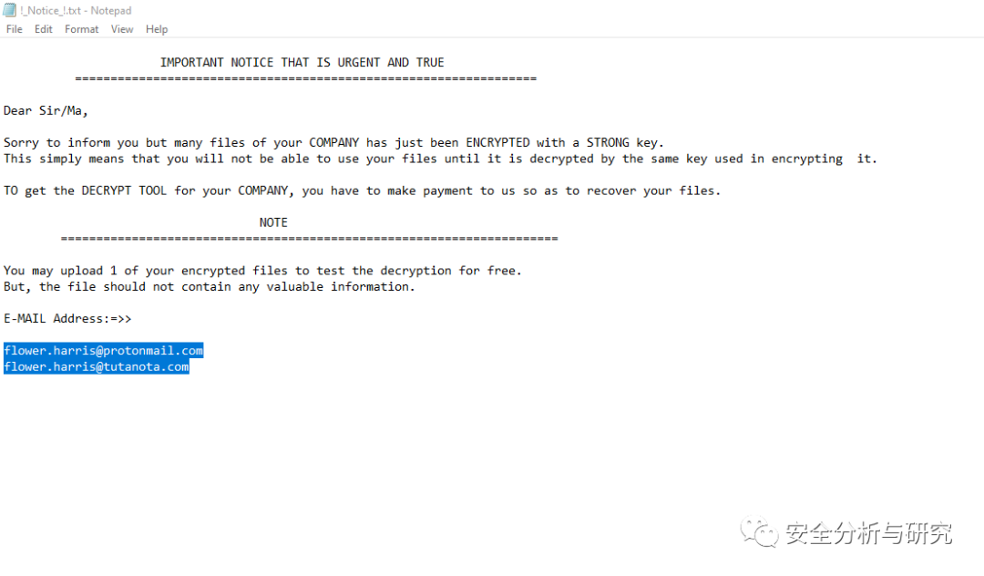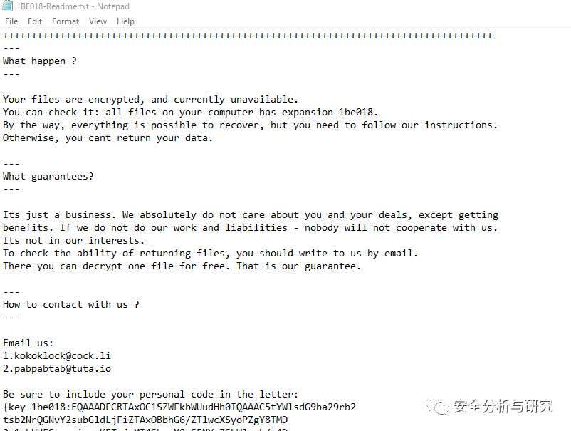 此勒索病毒加密后的文件为:随机名,生成的勒索提示信息文件名为:[随机名]-Readme.txt,内容如下所示: