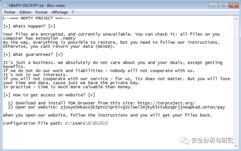 此勒索病毒的加密后缀为.nemty,勒索提示信息文本文件为NEMTY-DECRYPT.txt,内容如下所示: