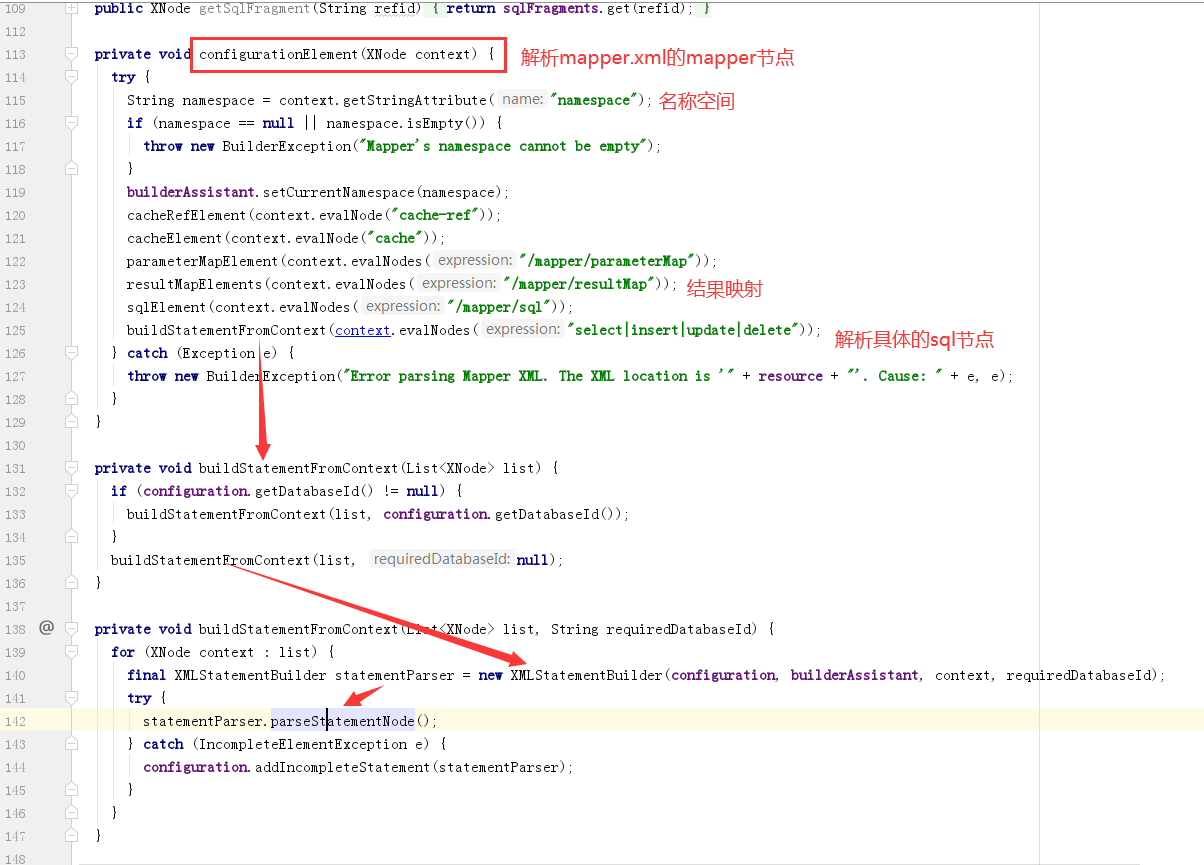 方法比较简单,就是读取对应节点的数据,进行解析,重点是调用的这些解析方法,可以看到一些我们平时最常见的比如mapper节点上的namespace属性,还有常见的resultMap节点、sql节点等。