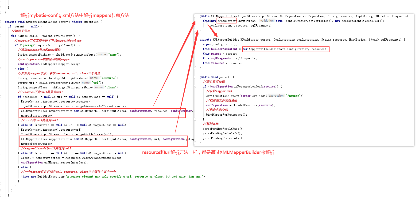 回顾下之前是在分析configuration的初始化过程,已经进行到了最后一步mapperElement(root.evalNode("mappers")),这个方法里有两种解析mapper的方法,一种是解析类,一种是解析xml文件,上一篇文章在讲解析类中的注解,今天说到的就是解析xml的流程,关键代码如下: