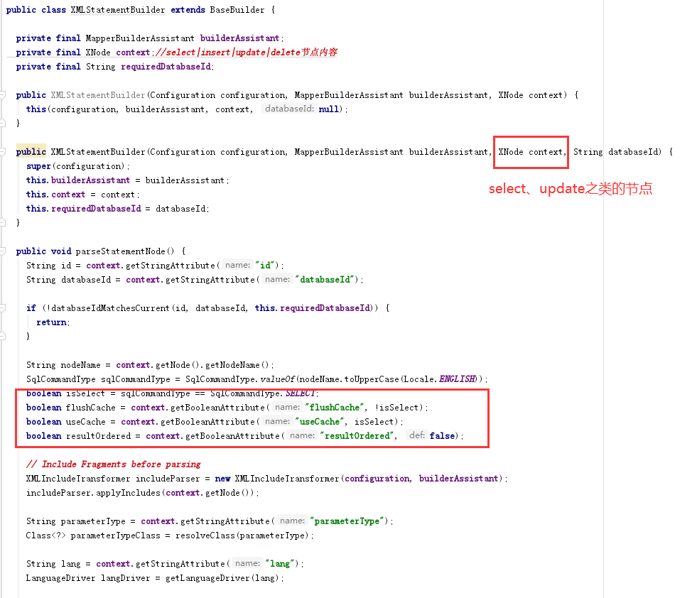XMLStatementBuilder与XMLMapperBuilder一样都是继承BaseBuilder类,它的XNode类型属性context对应mapper文件中一个select、update等节点。初始化方法没什么说的,主要看parseStatementNode方法,上图中已经截图一部分,剩下部分如下图: