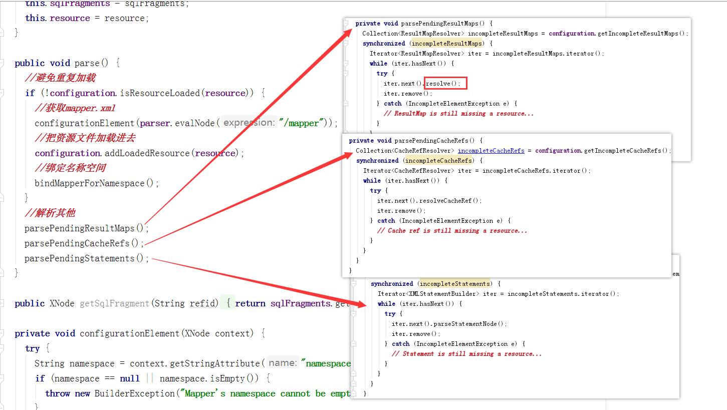 第一三步比较简单就不在详细说了,而第四步是也就是parse方法最后三行代码,他的主要作用是解决在第二步解析mapper时不能处理的一些数据进行处理,代码比较简单不在详细分析了,源码如下: