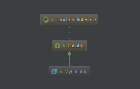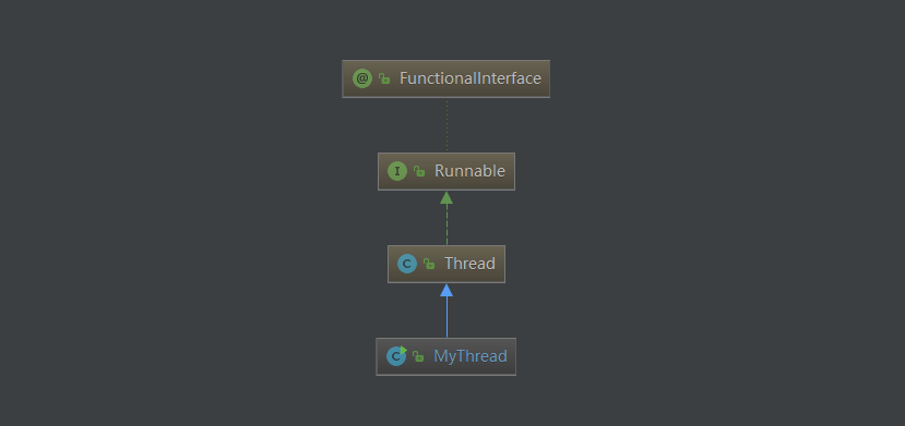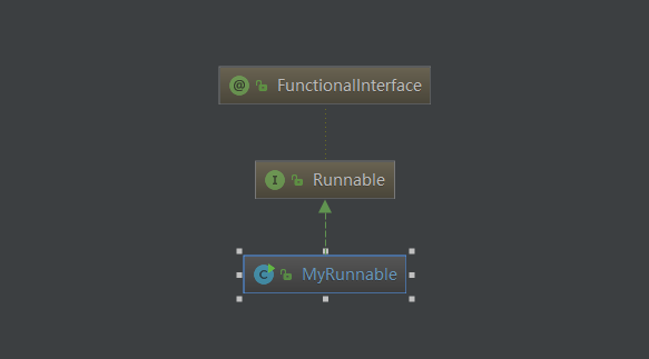 如上类图,MyRunnable实现了Runnable接口。其中Runnable由@FunctionalInterface注解标注,也就是可以用函数式编程的方式简写,简写后如下: