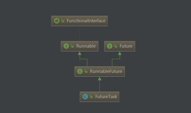 此时引入了另一个类FutureTask,它的构造方法中可以接收Callable,再看它的类图,间接实现了Runnable接口,这下豁然开朗。