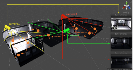 最后,我们在Unity3D的多个室内外场景下模拟真实监控定制了多摄像机环境和行走路径,并导入大量三维人物同时进行行走穿插和多摄像机录像。