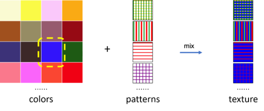 因此,我们进一步对颜色和纹理模式进行采样和组合来产生更具多样性的纹理映射图。我们在HSV空间均匀地采样了625种颜色作为调色板(如图4所示),并绘制了16种不同的纹理模式(如图5所示)。