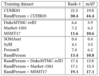 通过训练行人再辨识模型并直接跨库测试泛化性能,我们首次证明了虚拟数据上训练的行人再辨识模型可以更好地泛化到未知场景的真实图像上:对比之下RandPerson一举超越了CUHK03,Market-1501,DukeMTMC-reID和几乎MSMT17在内的四大主流行人再辨识数据集。