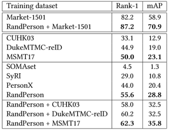 第一,在跨库测试时,数据融合后训练的结果比单独使用单个真实数据集有大幅提升,这表明RandPerson虽然是个虚拟数据集,但是在训练时依然可以作为真实数据集的有效补充。
