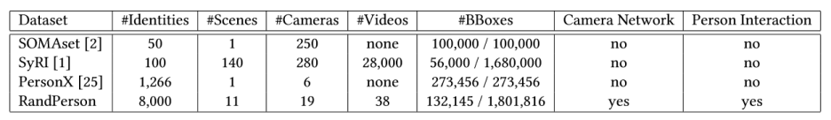 通过以上步骤,我们创建了一个虚拟行人数据集,称为RandPerson。它包括8,000个人物和1,801,816张图片。表1统计了RandPerson和其他虚拟行人数据集的一些特征。除了拥有更多的人物和图片数外,RandPerson最重要的特征是与真实监控场景类似,有多人同时在场景中进行运动并由多摄像机同时拍摄。