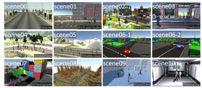 我们从Unity3D资源商店下载了8个室外场景和3个室内场景,模拟不同场景下的行人数据。通过场景的改变,可以产生不同光照、背景的数据;通过架设不同的摄像机,可以产生不同视角、清晰度的数据;通过行人的运动(走路和跑步等),可以产生不同姿态的数据。在一些场景中,我们通过将光照强度在0到1.5之间逐渐改变来模仿一天中光照的变化。图8展示了本文用到的11个场景。