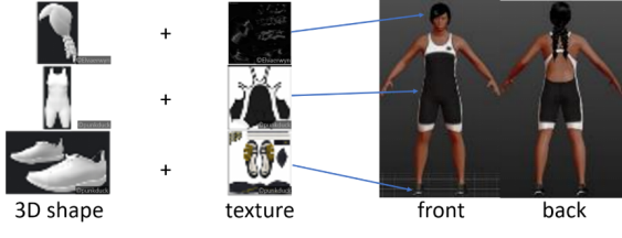 具体地,本文提出一种通过随机组合颜色和纹理产生大量UV纹理图的方法,并由此创建了大量的三维衣服模型。随后,针对MakeHuman的人物格式,我们设计了一个代码随机生成各种不同的身高、皮肤、衣服穿搭和配饰的三维人物模型。