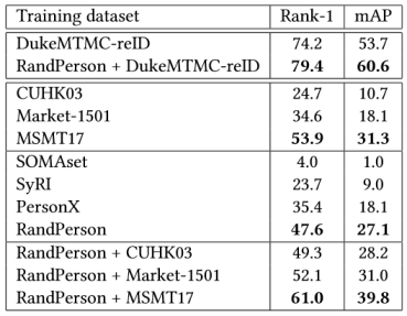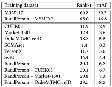 表5. MSMT17作为测试集的结果 一种缩短这种差异的方法是将虚拟数据和真实数据融合在一起当做一个数据源进行训练,结果也列在表2-5中。
