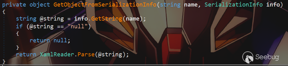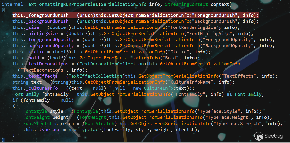 很明显,这个函数用于在反序列化时重构TextFormattingRunProperties实例,数据都是从SerializationInfo 对象里提取的。重点在于这个 GetObjectFromSerializationInfo() 函数,根据字段名从 info 提取数据。我们进去看看: