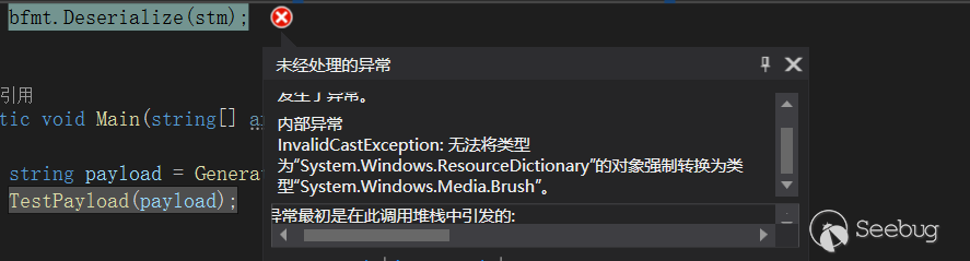 在这里的GetObjectData()方法里,我们直接调用SerializationInfo 的 SetType() 和 AddValue() 方法来设置类型和数据。但是我们将类型设置为 TextFormattingRunProperties,并添加了ForegroundBrush 字段,其值设置为xaml Payload。这样做的结果就是,当我们使用BinaryFormatter 去序列化PayloadClass 的实例时,生成的序列化数据和PayloadClass 完全没关系,而是只和我们设置的 TextFormattingRunProperties 类型有关。