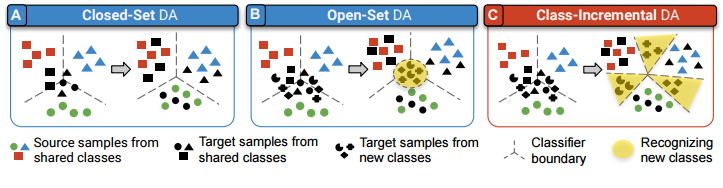 Figure 1. A comparison between (a) closed-set domain adaptation, (b) existing methods for open-set domain adaptation, and (c) our open-set domain adaptation with category-agnostic clusters.