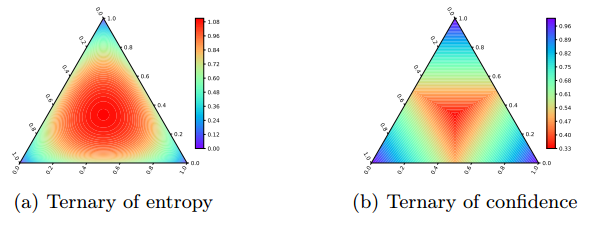 Fig. 2. Heatmap of entropy (a) and confidence (b) w.r.t. the probability values of three classes. Each edge is the value range [0, 1]. The corner area represents class distributions where one label is very likely, while the center area shows nearly uniform distribution.