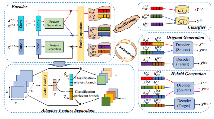 Fig. 1: Overview of the proposed HGNet, which mainly includes four components: encoder, decoder, classifier and adaptive feature separation module. The encoder firstly aims to extract convolutional features, and then the adaptive feature separation module attempts to learn classification-relevant and classificationirrelevant units. On one hand, we utilize label information to guarantee the effect of feature separation. On the other hand, we explore two reconstruction manners to promote the completeness of semantic information and the uniqueness of learned feature.