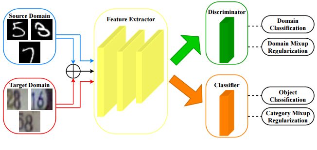 Fig. 1: Comparison of DANN and the proposed method. Left: DANN only tries to match the feature distribution by utilizing adversarial learning; it does not consider the class-aware information in the target domain and samples from the source and target domains may not be sufficient to ensure domain-invariance of the latent space. Right: Our proposed method uses category mixup regularization to enforce prediction consistency in-between samples and domain mixup regularization to explore more intrinsic structures across domains, resulting in better adaptation performance.