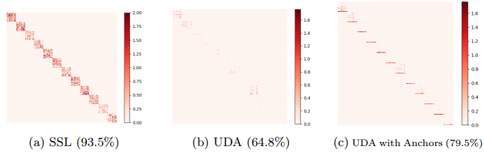 Fig. 1: Visualization of sub-affinity matrices for the settings of (a) SSL, (b) UDA, and (c) UDA with augmented anchors, and their corresponding classification results via the LP. The row-wise and column-wise elements are the unlabeled and labeled instances, respectively. For illustration purposes, we keep elements connecting instances of the same class unchanged, set the others to zero, and sort all instances in the category order using the ground truth category of all data. As we can see, the augmented anchors present better connections with unlabeled target instances compared to the labeled source instances in UDA.