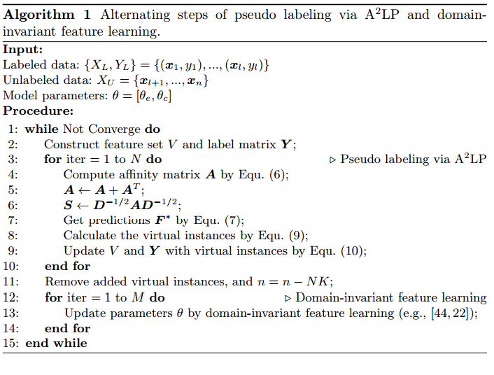 Fig. 2: An illustration of the overall framework of alternating steps of pseudo labeling via A2LP and domain-invariant feature learning. The dashed line rectangle illustrates the algorithm of A2LP, where we iteratively do the steps of (1) augmenting the feature set V and label matrix Y with the generated virtual instances and (2) generating virtual instances by the LP algorithm based on the updated feature set V and label matrix Y .