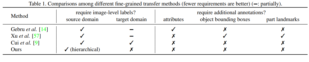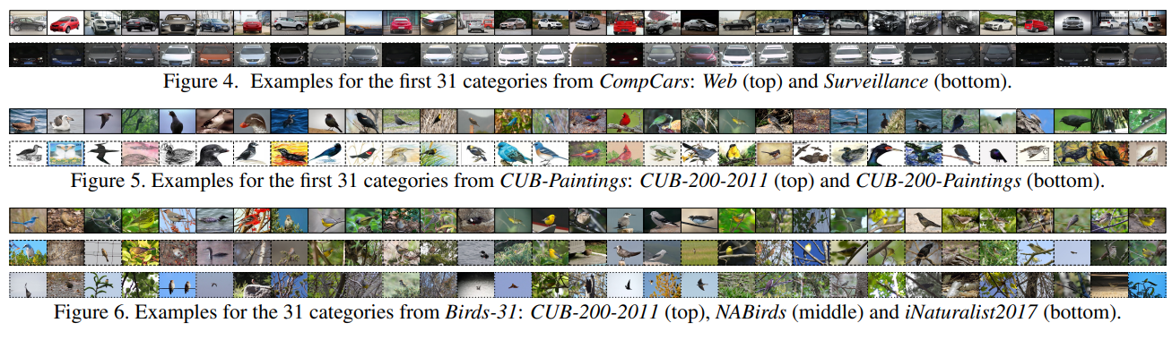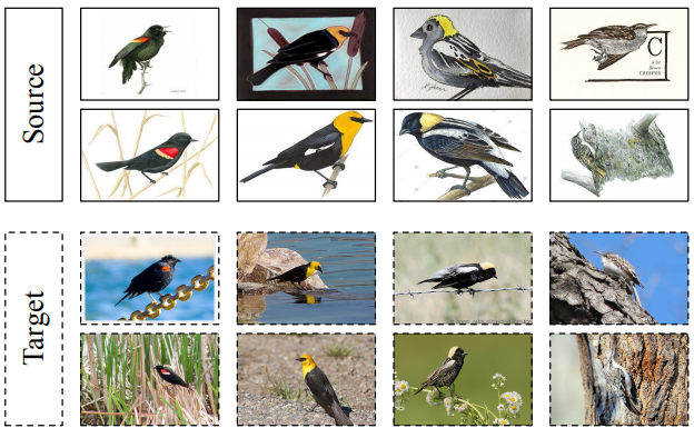 Figure 1. The fine-grained domain adaptation problem is characterized by the entanglement of large inter-domain variations, small inter-class variations, and large intra-class variations, which differs from classic domain adaptation scenario in granularity. From left to right: red-winged blackbirds, yellow-headed blackbirds, bobolinks, and brown creepers.