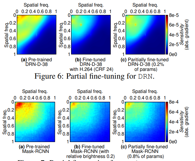 Figure 4: Comparing the DCT spectral sensitivity (frequency response) of the original and fine-tuned DRN-D-38. We use different color palettes for the sensitivity in the 1st row and the sensitivity difference (can be negative) in the 2nd row.