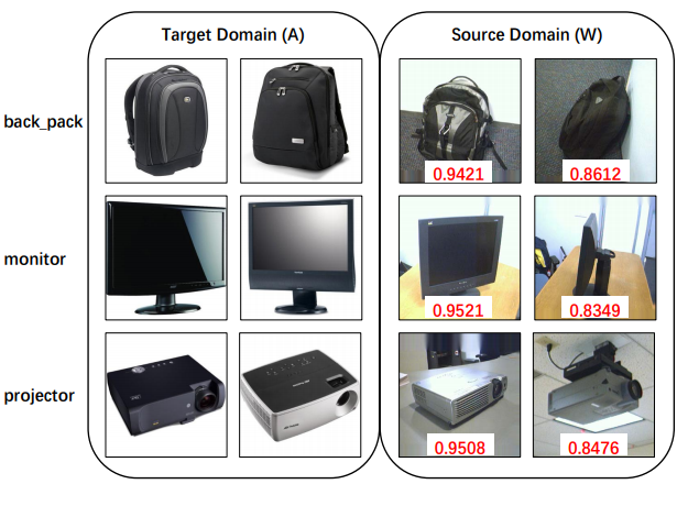Figure 2. The images on the left are randomly sampled from the target domain A and those on the right are the top-ranked (the 3 rd column) and bottom-ranked (the 4 th column) samples from the source domain W for three classes. Note that the red numbers are the source weights computed by (12).