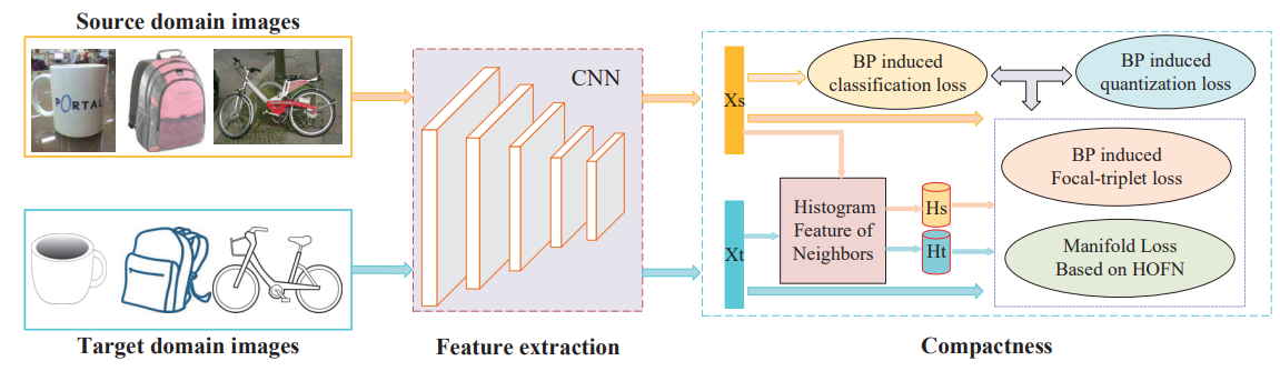 Figure 2. Diagram of PWCF, which includes four parts: 1) BP induced focal-triplet loss, 2) BP induced classification loss, 3) BP induced quantification loss and 4) manifold loss based on Histogram Feature of Neighbors.
