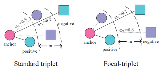 Figure 3. Illustration of the proposed BP induced focal-triplet loss: Standard triplet makes the positive sample closer to the anchor and the negative sample further away from the anchor by the same force (weight). However, positive samples and negative samples may not be separated for hard pairs in this case, which results in training instability. To address it, our BP induced focal-triplet loss can down-weight easy pairs and up-weight hard pairs so as to the distance to the cross-domain positives can be minimized and the distance to the cross-domain negatives can be maximized.