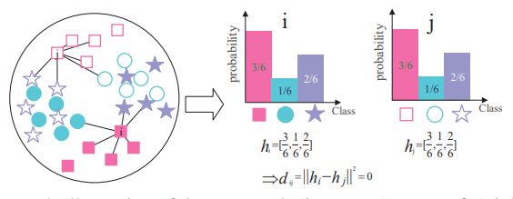 Figure 4. Illustration of the proposed Histogram Feature of Neighbors (HFON): We use different shapes to represent samples of different classes, The samples from the source domain and target domain are represented by solid and hollow shapes, respectively. i and j belong to the same class, but the distance is far. To measure the similarity of cross-domain samples more accurately, we proposed a Histogram Feature of Neighbors according to the neighbor relationship in a domain. For example, we find 6 nearest neighbors of i and j in their respective domains and calculate the probability of each class of these nearest-neighbor samples. HFON vector is made up of these probabilities. Then the HFON distances of similar samples in different domains are close.