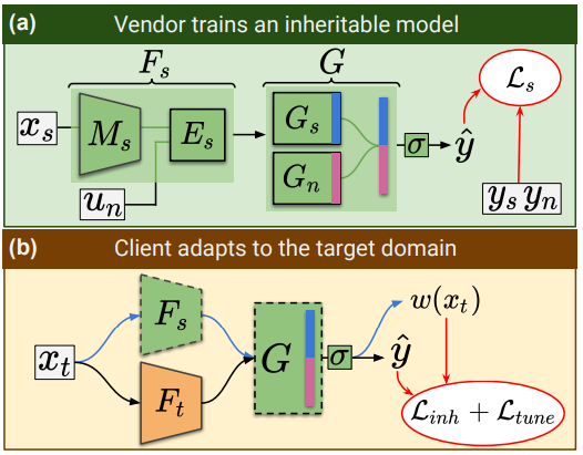 Figure 1. A) We propose inheritable models to transfer the taskspecific knowledge from a model vendor to the client for, B) performing unsupervised open-set domain adaptation in the absence of data-exchange between the vendor and the client.