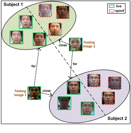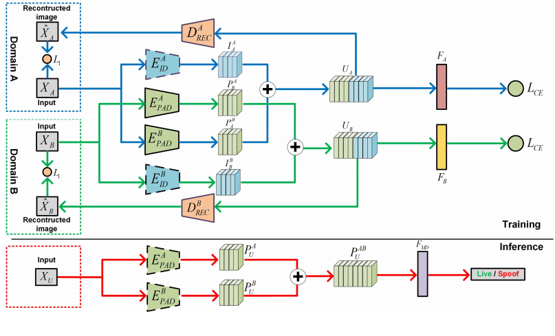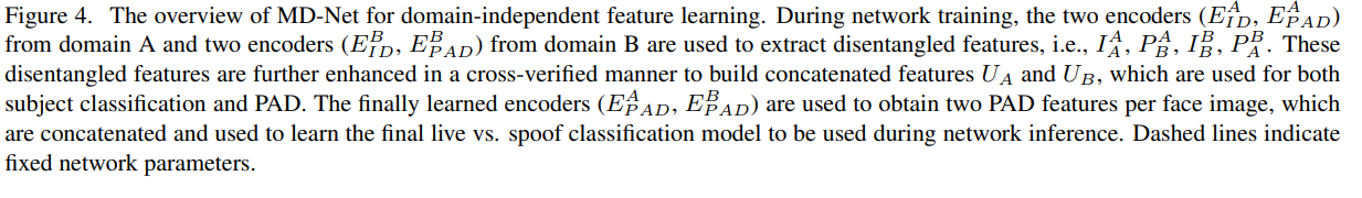 Figure 2. The overview of our approach for cross-domain PAD. Our approach consists of a disentangled representation learning module (DR-Net) and a multi-domain feature learning module (MD-Net). With the face images from different domains as inputs, DR-Net can learn a pair of encoders for disentangled features for PAD and subject classification respectively. The disentangled features are fed to MD-Net to learn domain-independent representations for robust cross-domain PAD.
