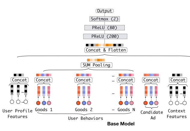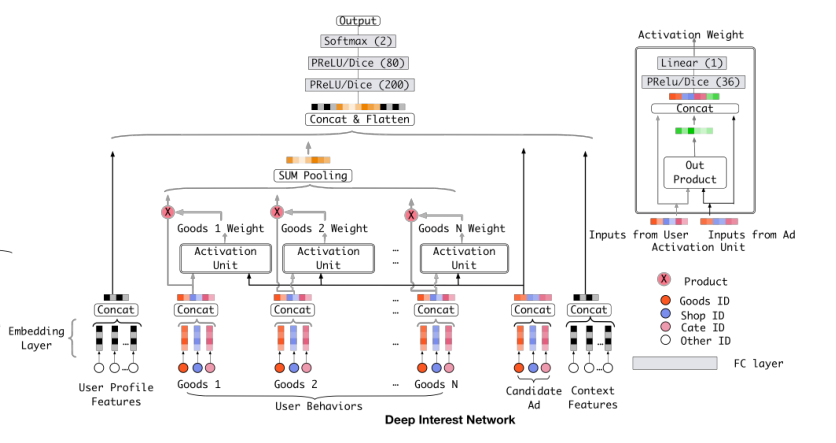 第一,阿里妈妈觉得待推荐的物品是否会被点击和用户的历史行为有着显著的关系,那么我们能不能使用用户的历史行为(也代表了用户的兴趣,Deep Interest大概从这里命名)来表征用户对于不同商品的兴趣呢,换句话说,我能不能使得用户对于不同的商品有不同的Embedding呢。然后他就把待推荐物品和用户历史点击行为进行Attention,他死不承认用Attention的一个原因大体就是他的Attention没有做正则化,以及他的Attention weights的sum=1。模型构建如下: