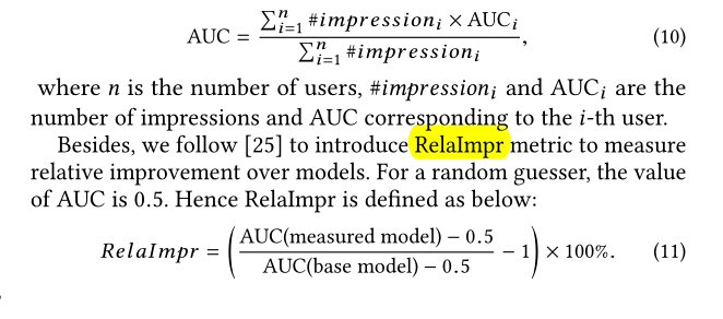第三,这个评价函数不像是AUC,后来发现这是推荐中常用的手法,叫做GAUC(如公式1),只需要保证用户点击的排在前面就可以,不是一定要排在第一个,具体可以详见GAUC,而且还有一种新奇的比较模型之间提升关系的方法,我很喜欢,如公式2: