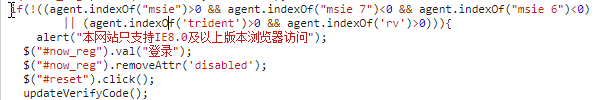 某天,某智障程序员写了几行错误的代码,导致了火狐和谷歌浏览器无法正常登陆,经过分析发现控制登陆的是一个js文件,其判断浏览器版本是否在IE8以上的语句如下图所示: