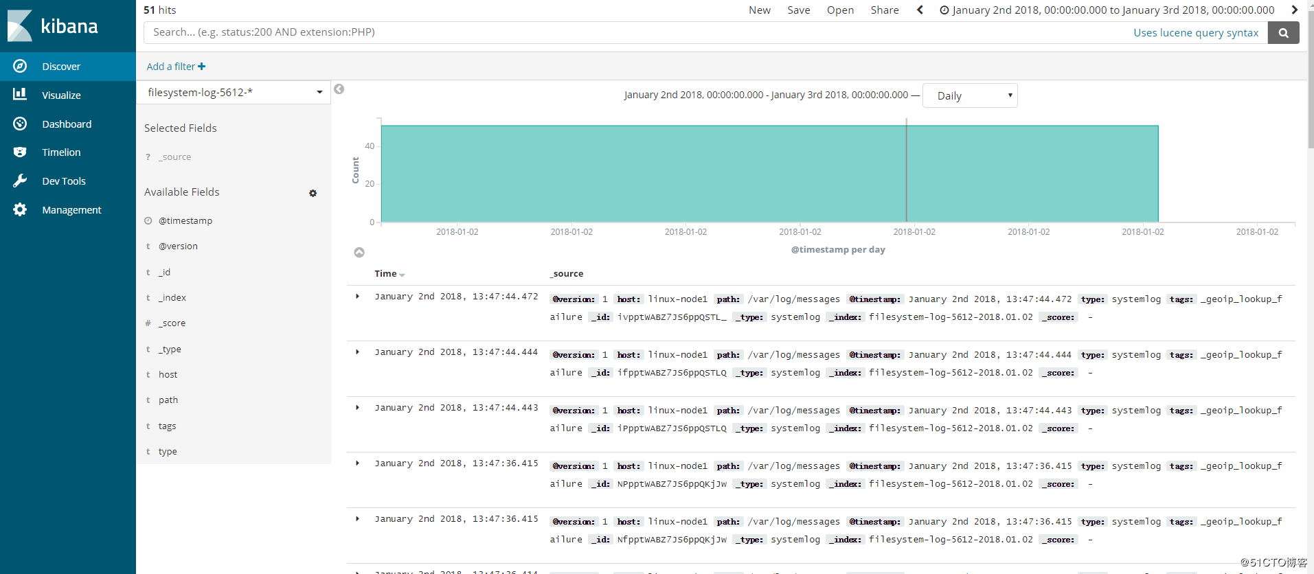 {"@timestamp":"2018-01-02T03:55:54.680Z","@metadata":{"beat":"filebeat","type":"doc","version":"6.0.1"},"message":"666666666666666","source":"/var/log/messages","offset":3164930,"prospector":{"type":"log"},"beat":{"name":"linux-node2","hostname":"linux-node2","version":"6.0.1"}}