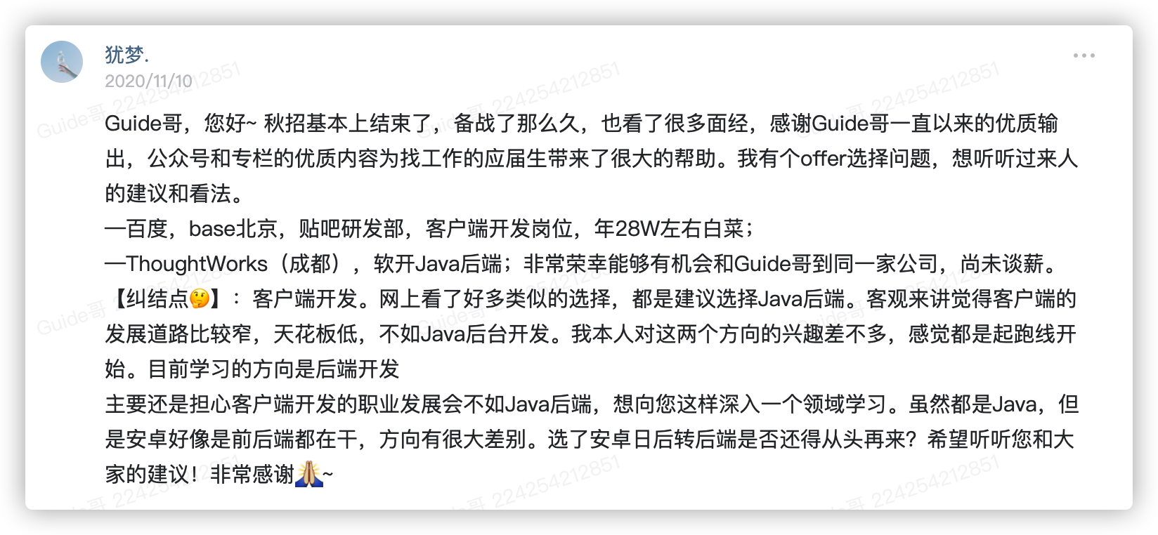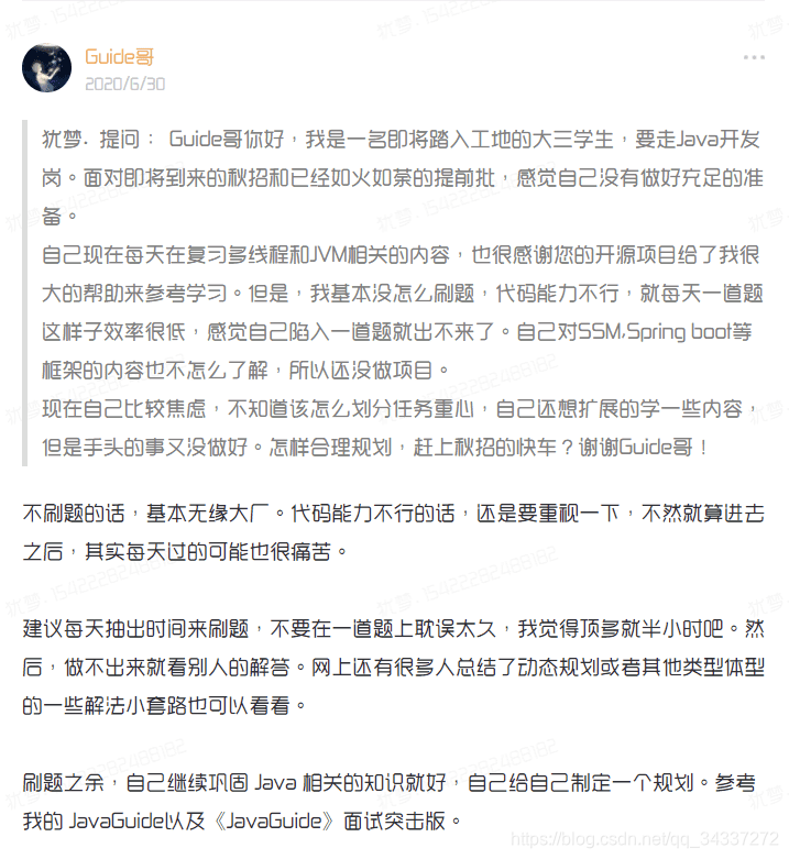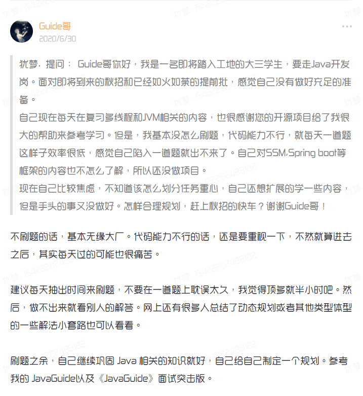 这是对 Guide 哥之前的一次提问,让我很清楚自己接下来的两个月该做什么!